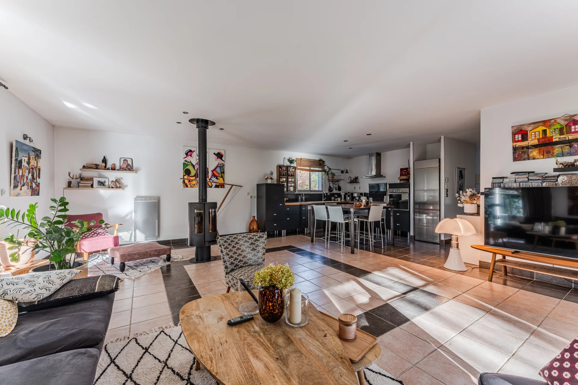 La maison dispose d'un vaste séjour qui s'ouvre sur une cuisine moderne et entièrement équipée. Cet espace de vie spacieux est parfait pour recevoir des amis et passer du temps en famille. Un poêle à bois ajoute une touche chaleureuse et authentique au séjour, tandis qu'une terrasse couverte permet de profiter de l'extérieur même par temps capricieux.